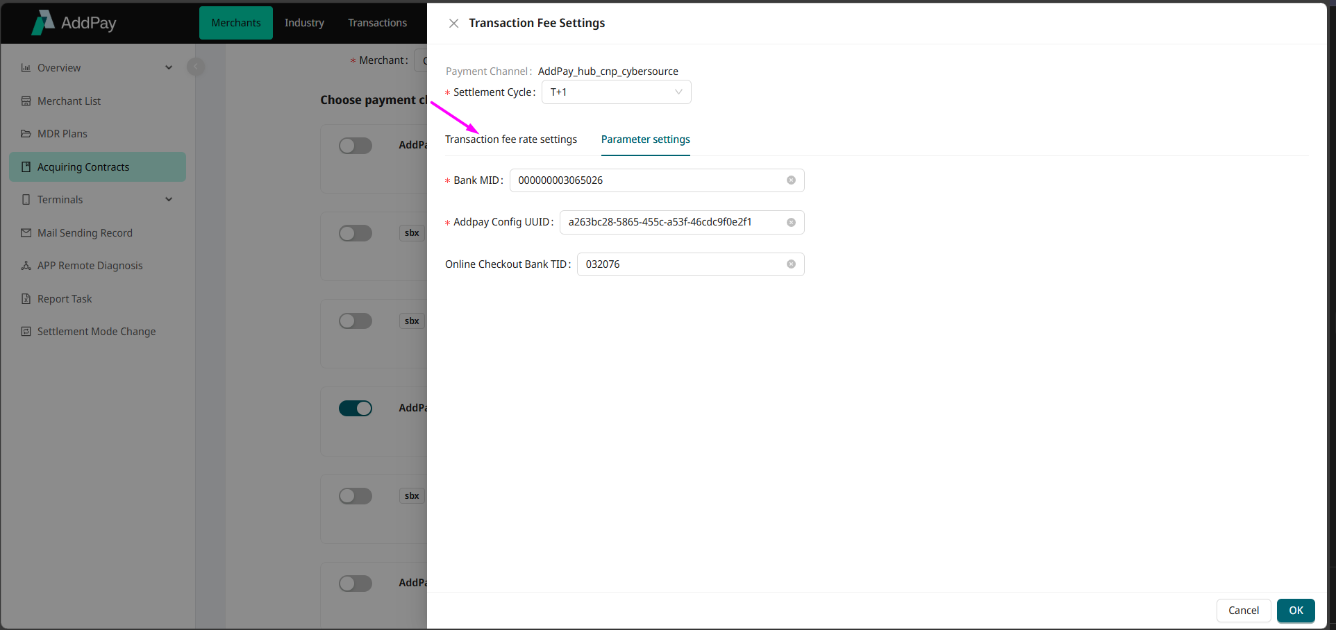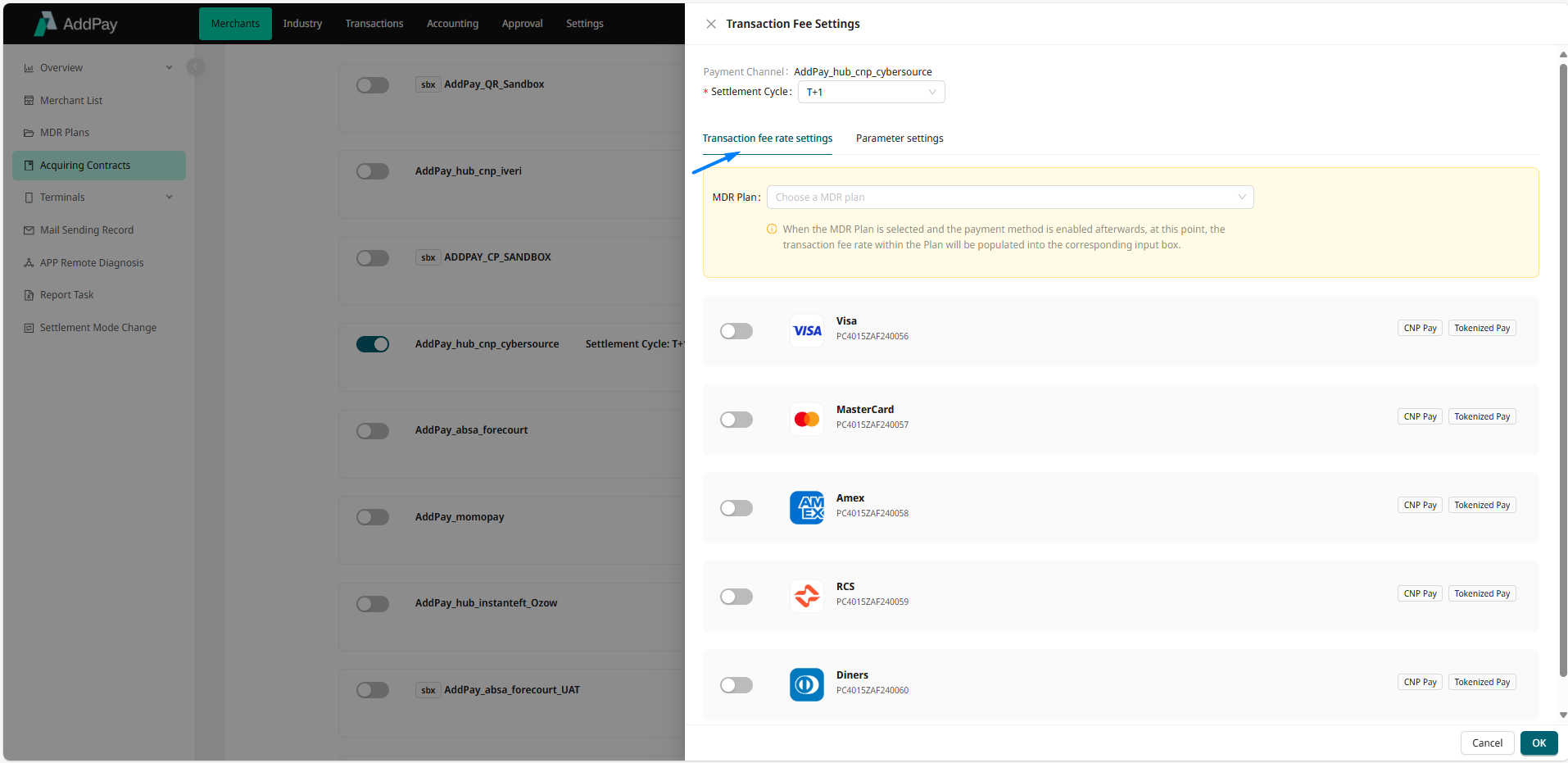 This article provides a step-by-step guide to configure CyberSource (CNP) integration on the AddPay PayCloud platform for front-end users. It focuses on enabling the payment channel, setting transaction fee rates, and adding parameter settings.