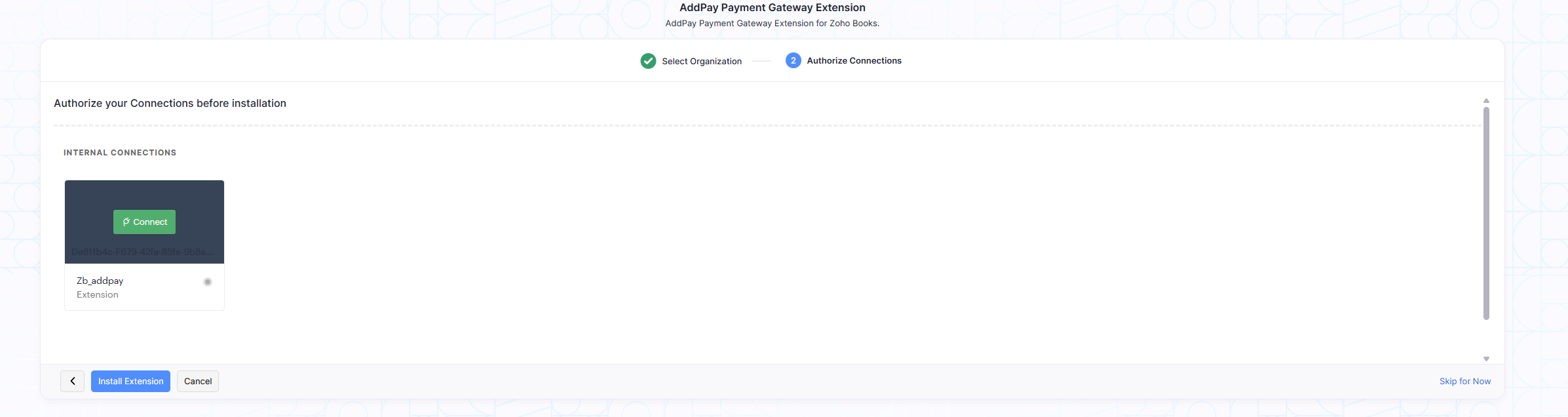 - Find the AddPay Payment Gateway Extension on the Zoho Marketplace and install it by following the prompts.