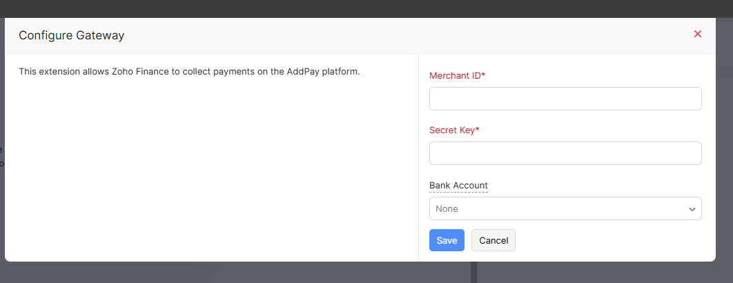 *Optional: You can also supply a Bank Amount through which all AddPay transaction Payments will be recorded in Zoho Books.